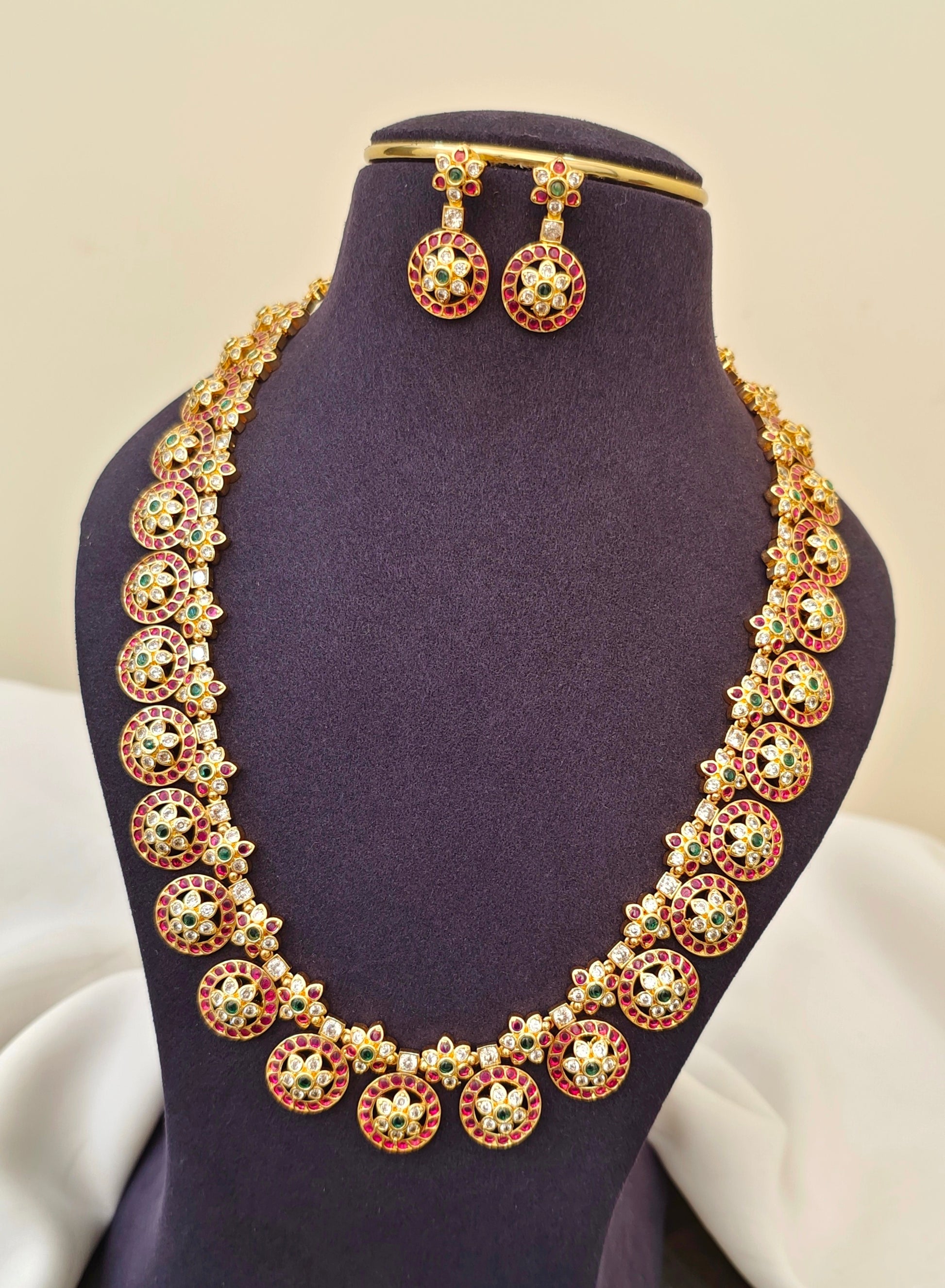 Elevate your traditional ensemble with this exquisite Bottu Mala Long, a timeless piece that seamlessly blends cultural heritage with contemporary elegance. Crafted with meticulous attention to detail, this extended mala features vibrant gemstones and intricate beadwork that cascade gracefully down the torso. Perfect for festivals, weddings, and special occasions, it adds an authentic touch of sophistication to any traditional outfit. The extended length ensures versatile styling options while maintaining the classic charm of this beloved accessory. An investment in timeless beauty that celebrates your cultural identity.