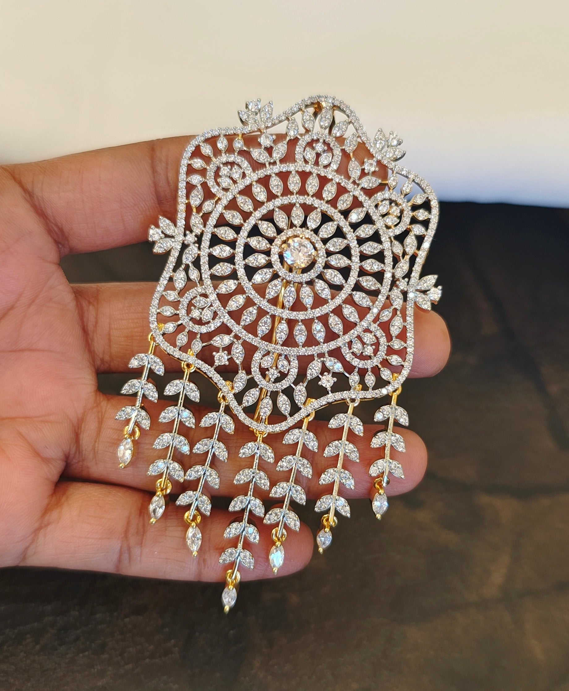 The Divine Bloom Jada Billa is a meticulously crafted hair accessory designed to enhance traditional hairstyles with elegance. Its intricate floral motifs and fine detailing make it an exquisite choice for special occasions, adding a touch of sophistication and cultural richness. Perfectly suited for bridal wear or festive events, this piece combines artistry with durability, ensuring it complements your look while maintaining comfort throughout the day. Elevate your ensemble with the timeless charm of the Divine Bloom Jada Billa.