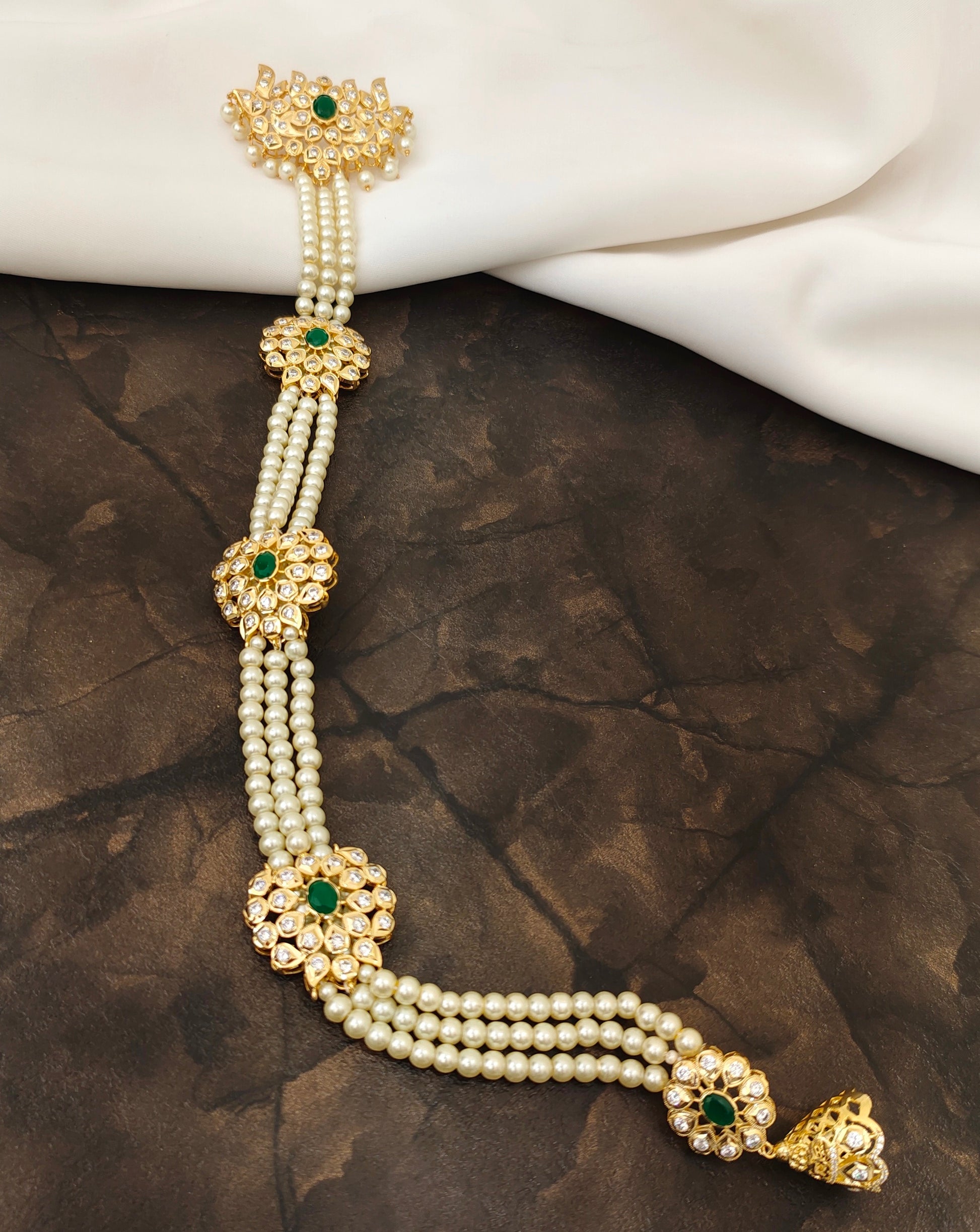 The Regal Pearl Jada is a sophisticated hair accessory designed to elevate traditional hairstyles with elegance. Featuring lustrous pearls meticulously arranged, it adds a refined touch to bridal or festive looks. Crafted for secure wear and lasting beauty, this piece complements intricate hairdos while enhancing your overall appearance with timeless charm. Ideal for those seeking a blend of classic grace and expert craftsmanship.